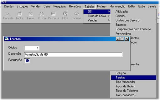 1.1. No menu Tabelas/OS/Tarefas, você deverá registrar as tarefas realizadas em sua empresa, e pontuar o grau de complexidade desta tarefa, como demonstrado na Figura.