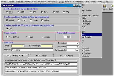 1.2. No menu Tabelas/OS/Parâmetros, você deverá informar o Índice de comissão e a % Comissão Repassada, como demonstrado na Figura.